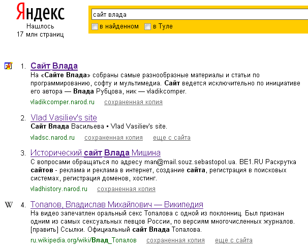 Для меня самого это стало неожиданностью, но факт. Мой Сайт Влада - первый Сайт Влада в Рунете по Яндексу. Это успех!