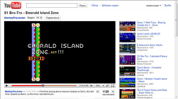 Из остального также хочется заметить, что "Другие видео от %username%" убрали из правой колонки и приурочили к верху страницы. Они отображаются по нажатию кнопки рядом с ником автора. Смотреть список роликов в таком представлении трудно, причем ко всем им зачем-то приписывается ник автора, хотя ясно, что все видео - его.