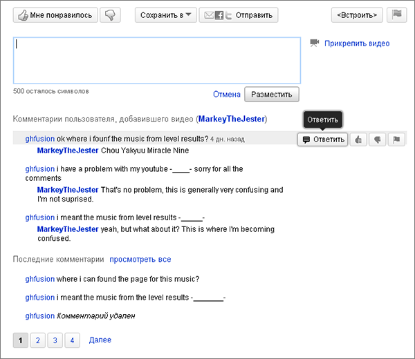 Но посмотрели дизайнеры на результат. Фигня какая-то, читать комменты не удобно. Тогда урезали количество комментов на странице и ввели наитупейшую классификацию на "Комментарии пользователя, добавившего видео" и "Последние комментарии", так каша из комментов подается меньшими порциями. Типа, за читаемость борятся.