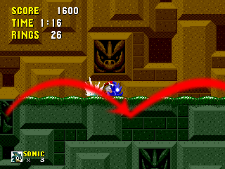 Только чтобы заставить соника прыгать по воде, надо, разогнавшись, свернуться в клубочек у самого обрыва перед водной поверхностью. Обычным прыжком в воду вы ничего не добьетесь.